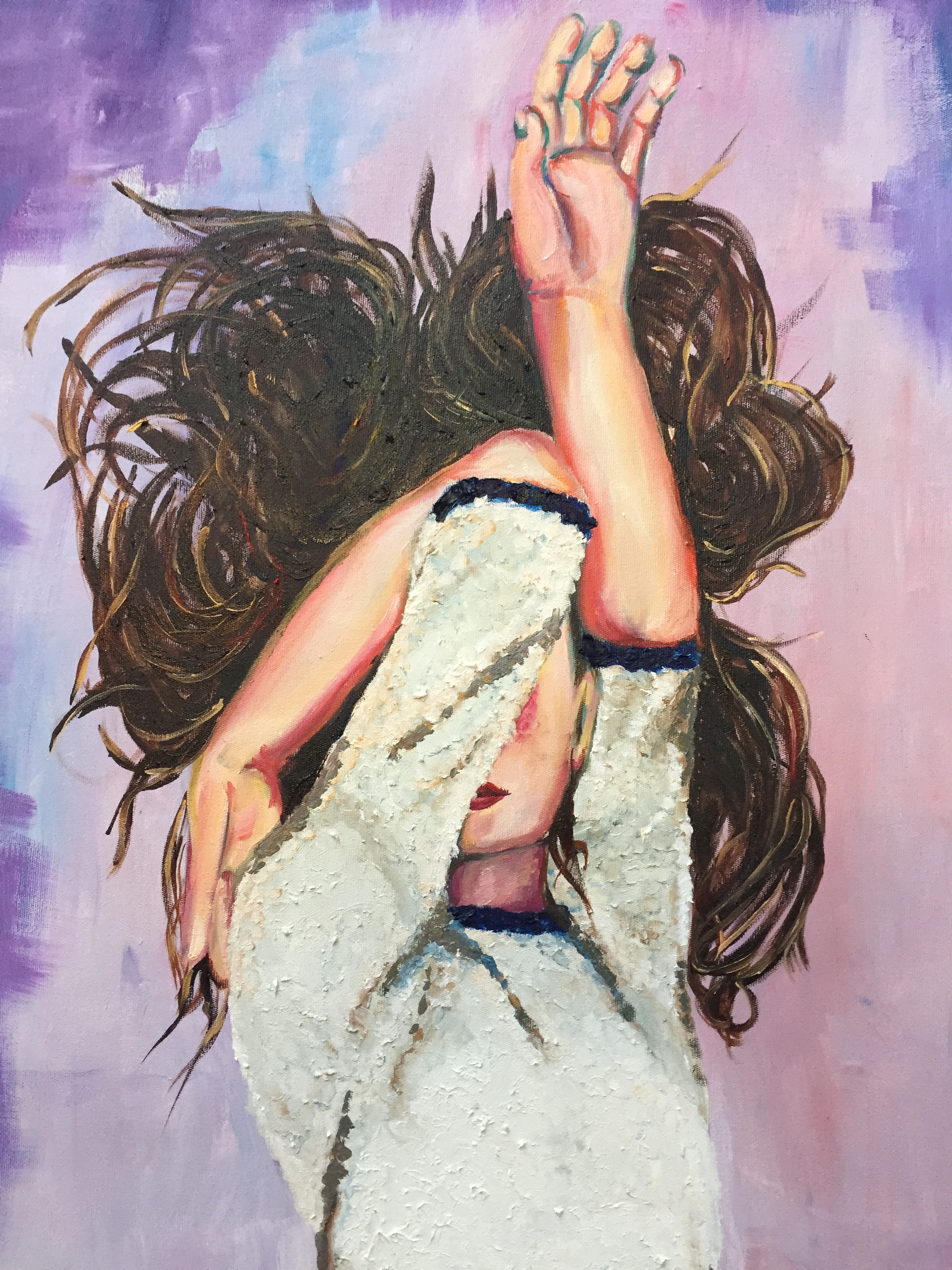 With Francette I was inspired by the feeling of falling you have whilst you are lying down. I wanted her to be falling slowly into this comforting purple surrounding, like she is letting go