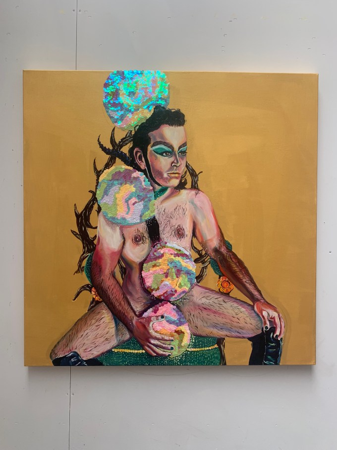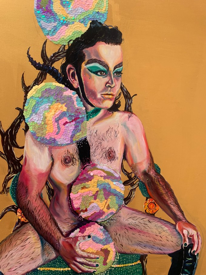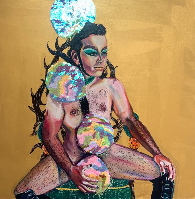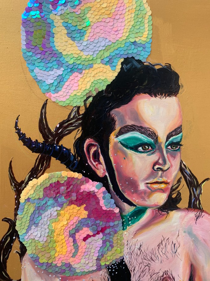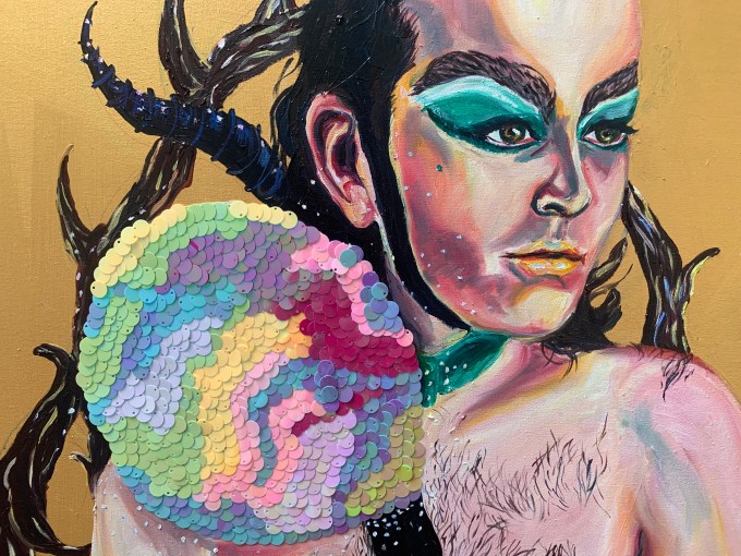 Oil paint and sequins on an iridescent gold canvas
